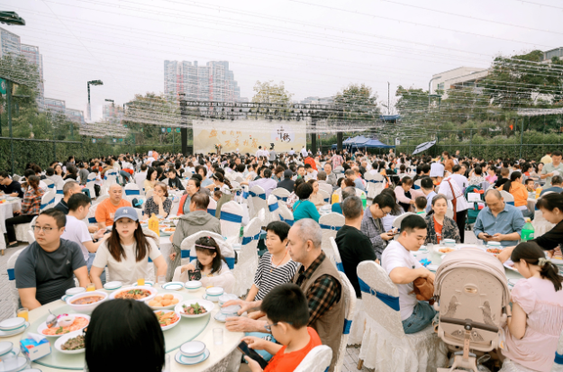 秋风携桂香漫入天府新区麓府组团的街巷,流转的月光已悄悄酝酿出团圆的暖意。业主家人们正满怀着期待蓄势待发 —— 一场融汇舌尖珍味与视觉雅趣的中秋盛宴,即将拉开帷幕,只待月色满庭时,共赴这场味与美的双重邀约。以天地为厅、乡邻为客,超千人的坝坝宴将川人的豁达热忱与饮食智慧熔铸于一方露天餐桌。用最本真的食材、最用心的手艺、最热闹的氛围,将川人的生活态度与饮食哲学娓娓道来。
