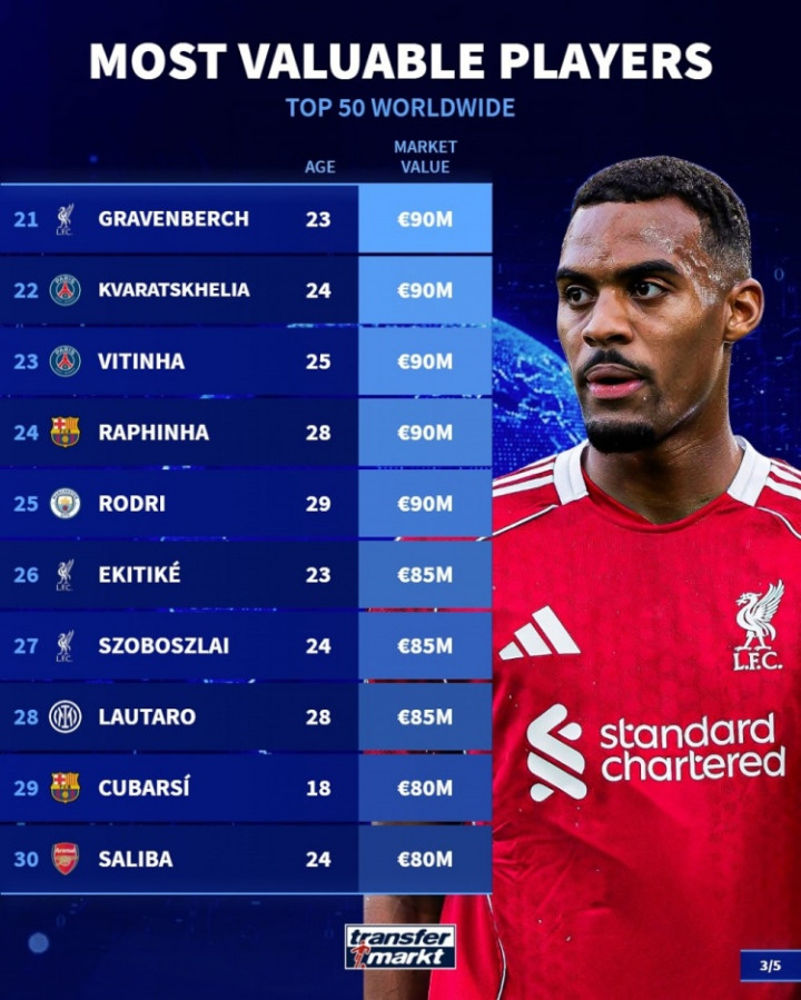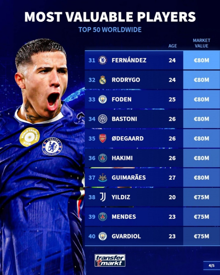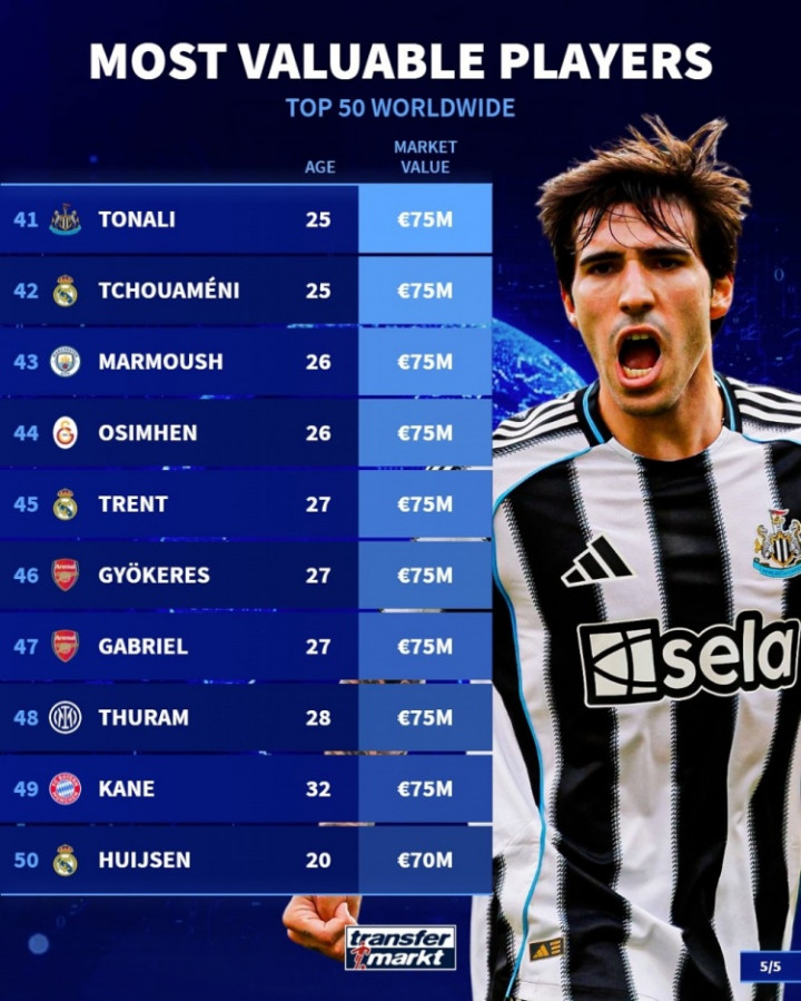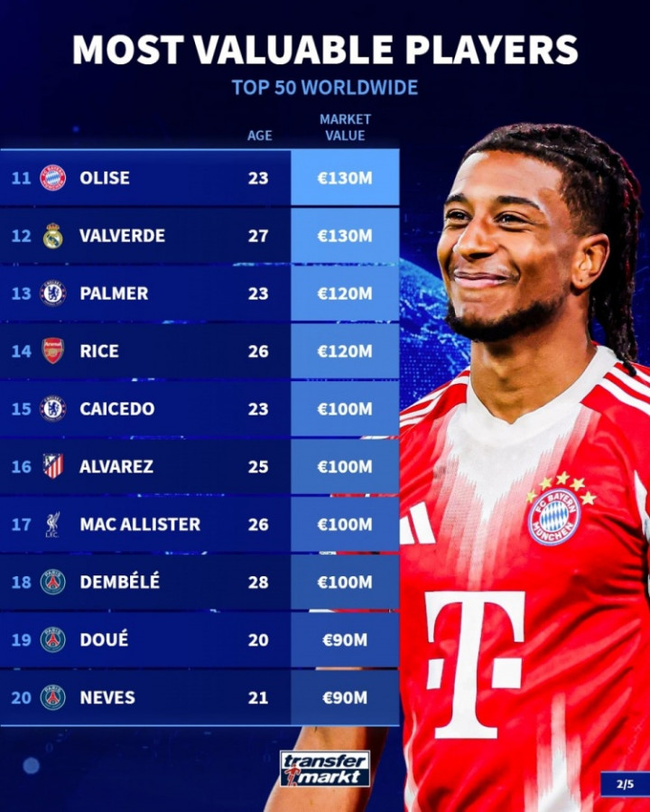 直播吧10月25日讯德国转会市场列出了球员身价前50排名,亚马尔2亿欧居首,贝林厄姆、哈兰德、姆巴佩1.8亿欧次席。